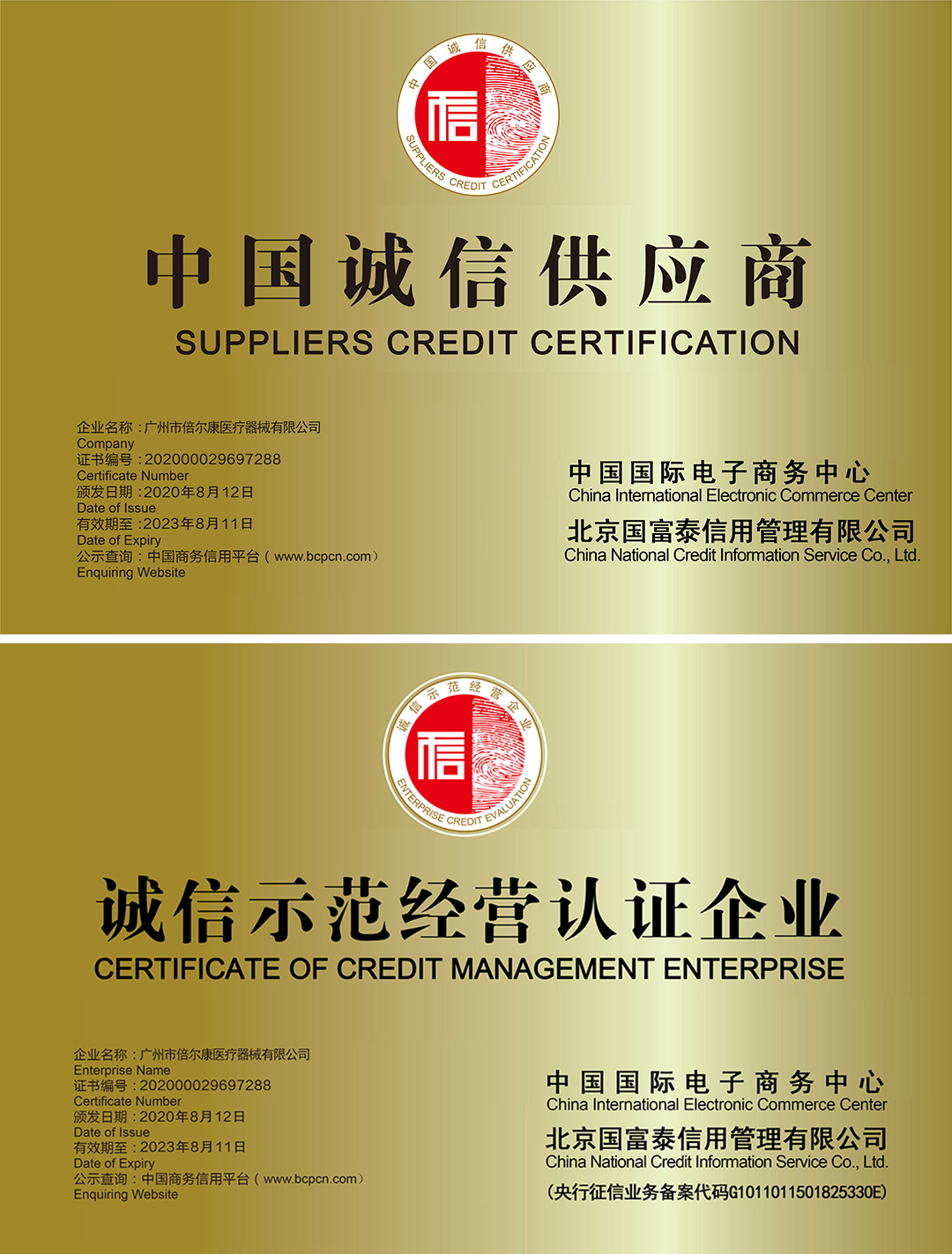 “中國誠信供應商”&“誠信示范經營單位企業(yè)”認證,是商務部頒發(fā)的國家級企業(yè)信用證明,是對倍爾康誠信經營的認可,也是權威機制保護商家和客戶雙方利益的行動證明。