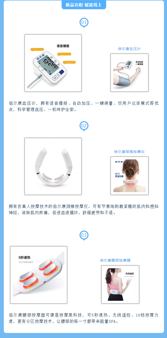 創(chuàng)新不止的倍爾康,產(chǎn)品研發(fā)不止步于體溫計,還包括了血壓計、按摩儀等產(chǎn)品,一起來看看吧!