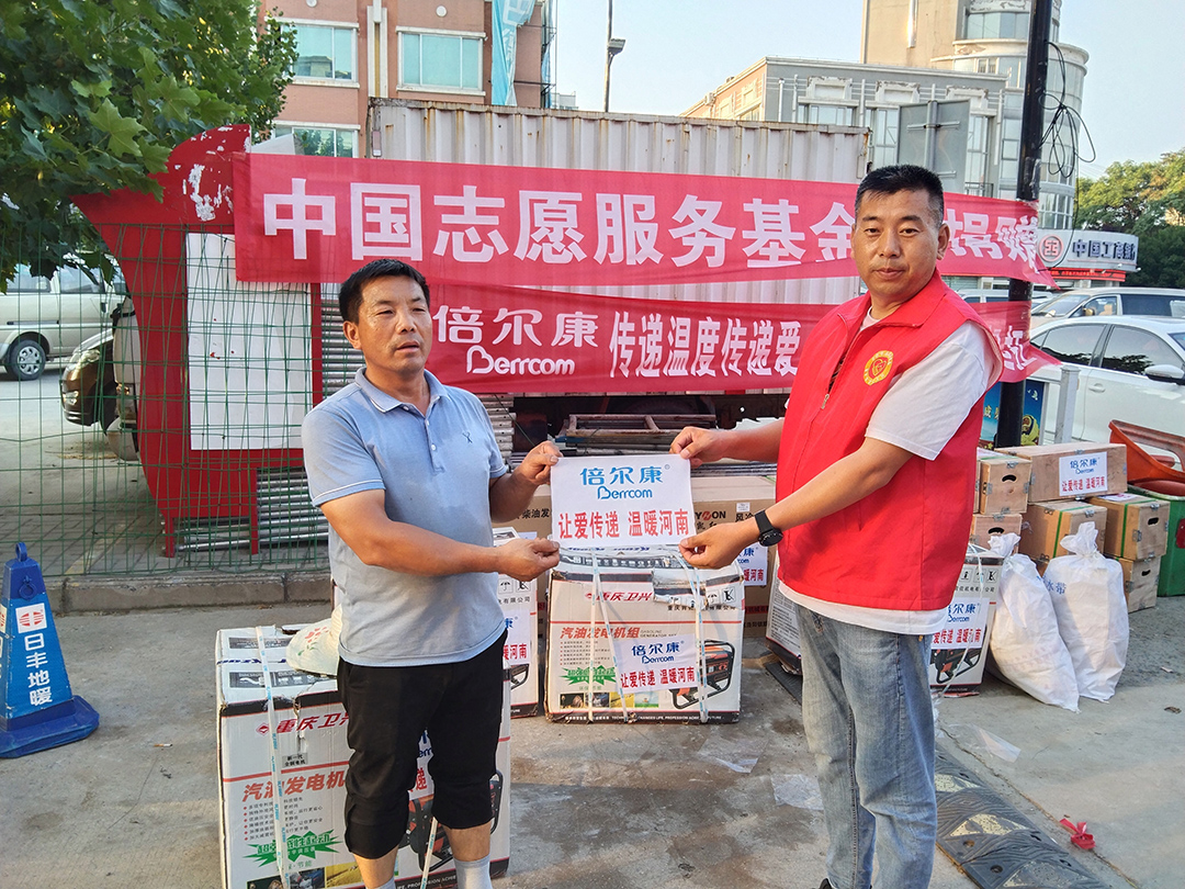 7月29日,倍爾康再次聯(lián)合公益組織——中國(guó)志愿服務(wù)基金會(huì),向河南周口、安陽(yáng)、新鄉(xiāng)三地捐贈(zèng)了救援物資:9臺(tái)玉柴發(fā)電機(jī),20臺(tái)污水泵以及20支排水管,共計(jì)10萬(wàn)元。