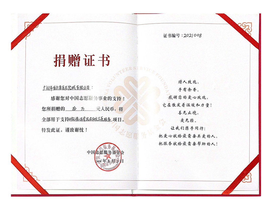 中國(guó)志愿服務(wù)基金會(huì)頒發(fā)的捐贈(zèng)證書(shū)