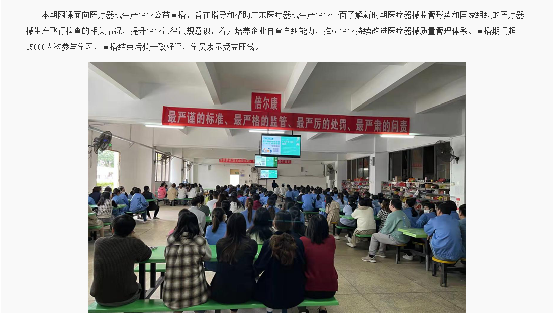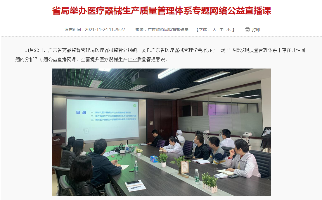 11月22日,廣東省藥品監(jiān)督管理局醫(yī)療器械監(jiān)管處組織,委托廣東省醫(yī)療器械管理學(xué)會(huì)承辦了一場(chǎng)“飛檢發(fā)現(xiàn)質(zhì)量管理體系中存在共性問(wèn)題的分析”專題公益直播網(wǎng)課,全面提升醫(yī)療器械生產(chǎn)企業(yè)質(zhì)量管理意識(shí)。
