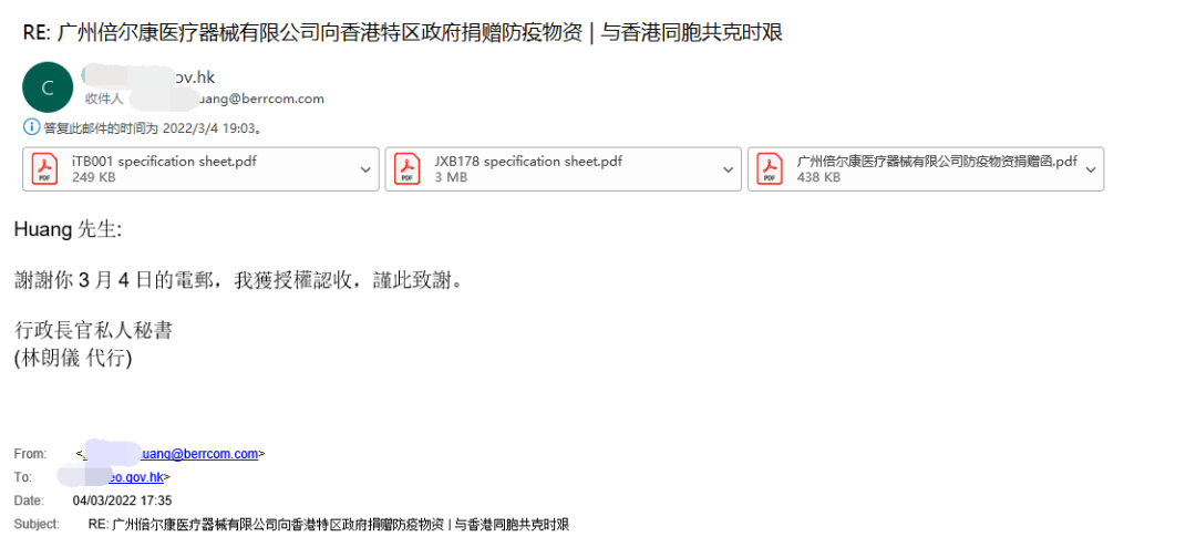 3月4日,倍爾康捐贈抗疫物資發(fā)出后,我們收到了來自香港行政長官秘書的致謝函。